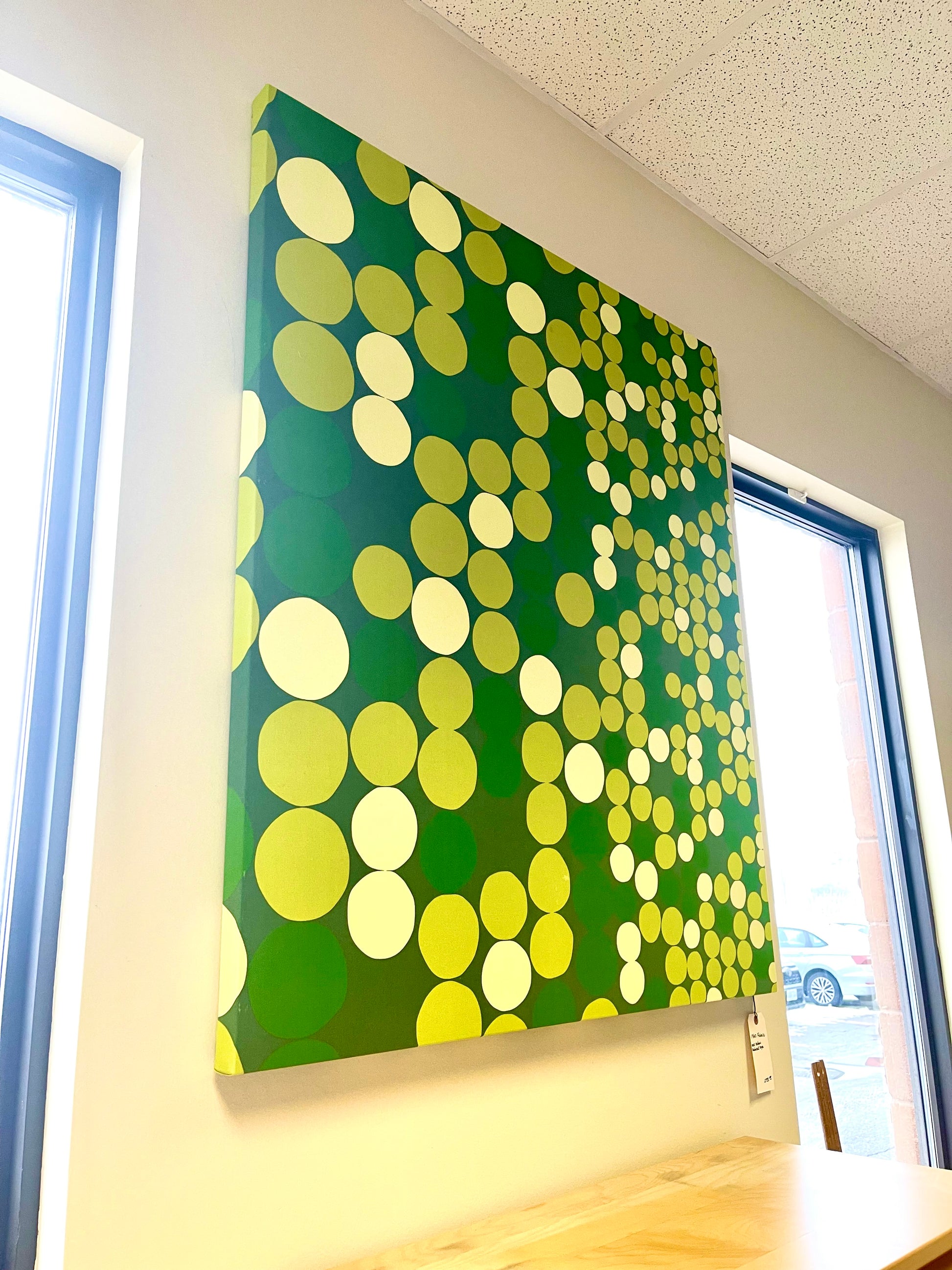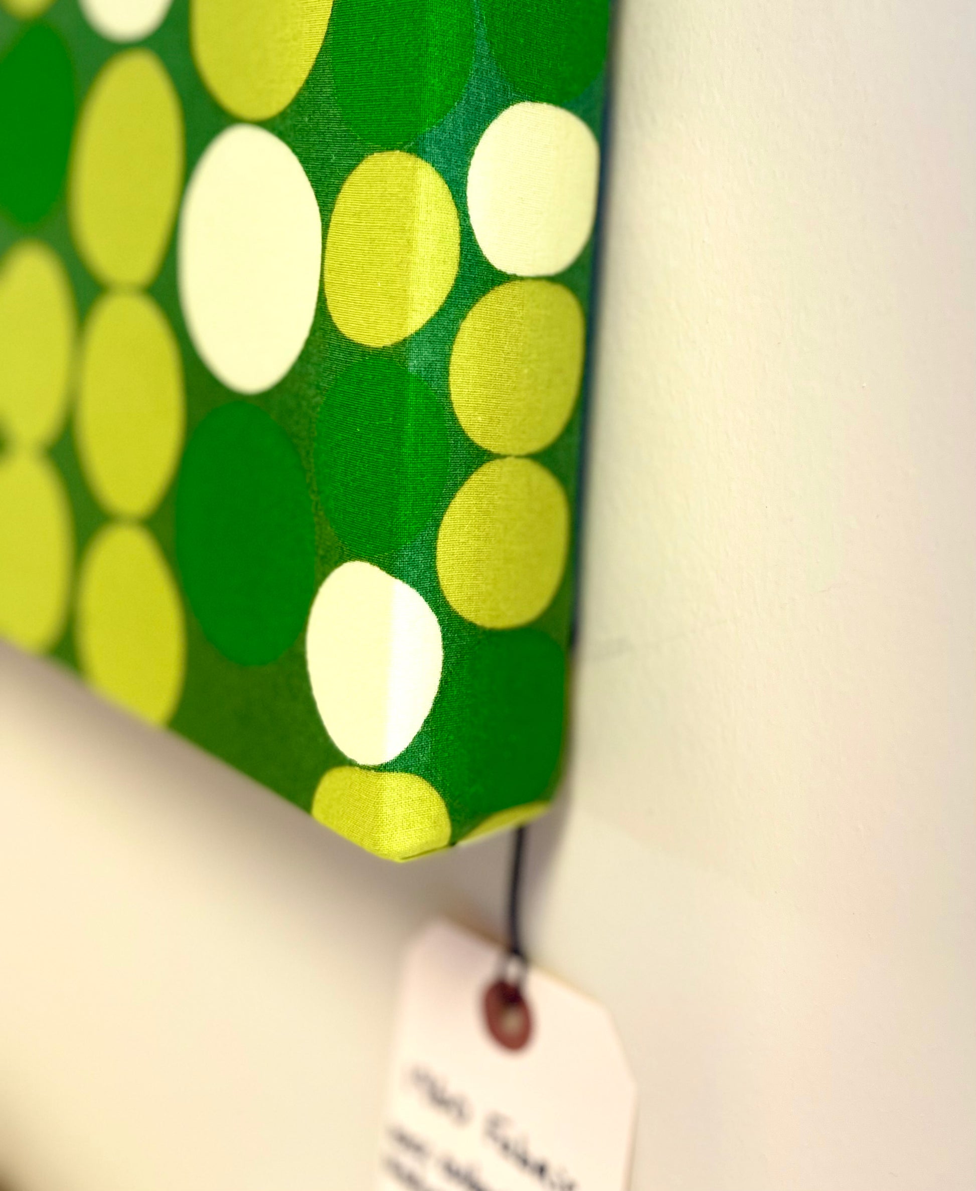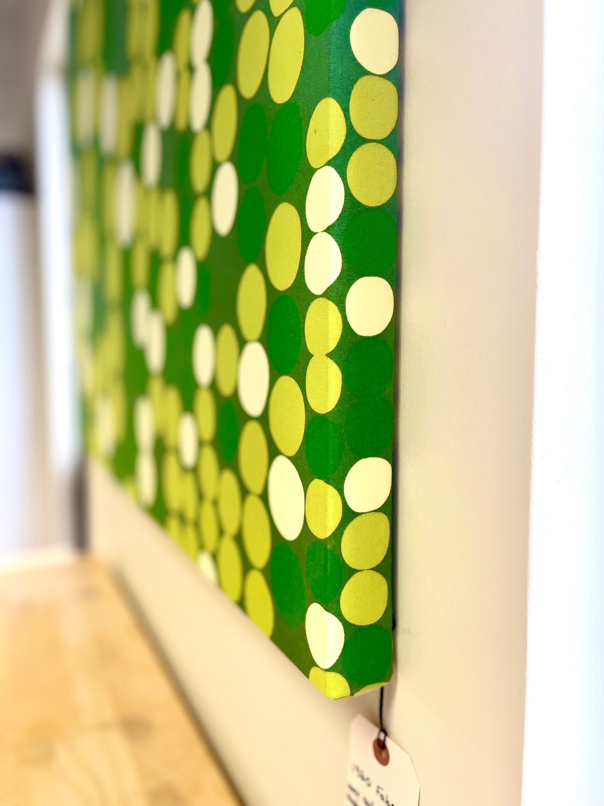 Measuring in at 57" x 47" this print, made in the 1960's / 70's is sure to make a statement on any wall. 100% cotton and naturally dyed, these geometric green dots add a pop of color and bring a unique touch to the overall design. This framed print is a must-have for any true mid century collector.