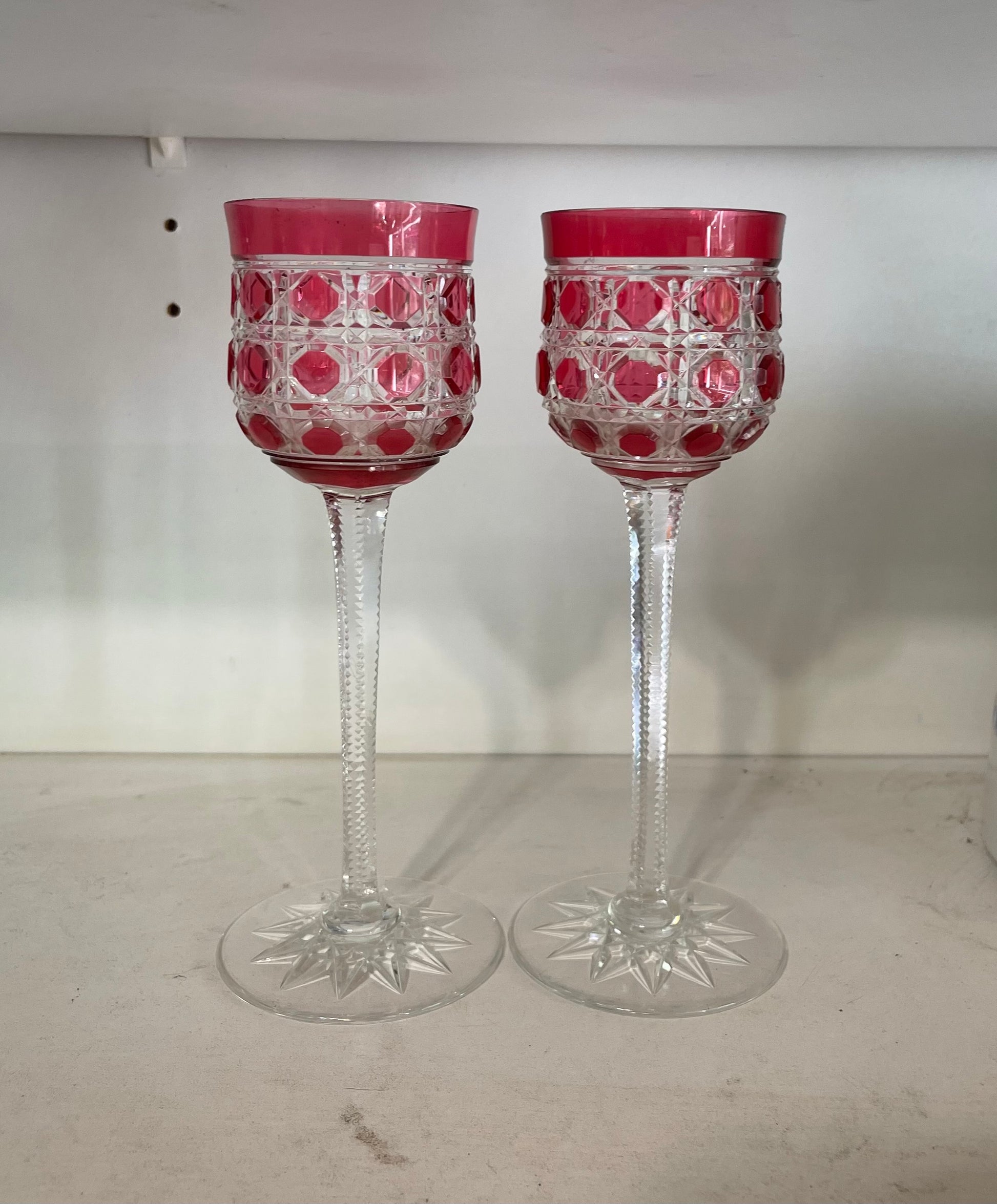 Discover the timeless beauty of this rare set of two (2) cranberry red Baccarat crystal tall cordial style glasses, crafted in the 1930s. With their stunning color and exquisite craftsmanship, these glasses are not only a flawless wedding, anniversary, or engagement gift but also a cherished addition to any discerning collector's Baccarat crystal collection. Let their elegance and charm enhance your special moments and elevate your celebrations to new heights.